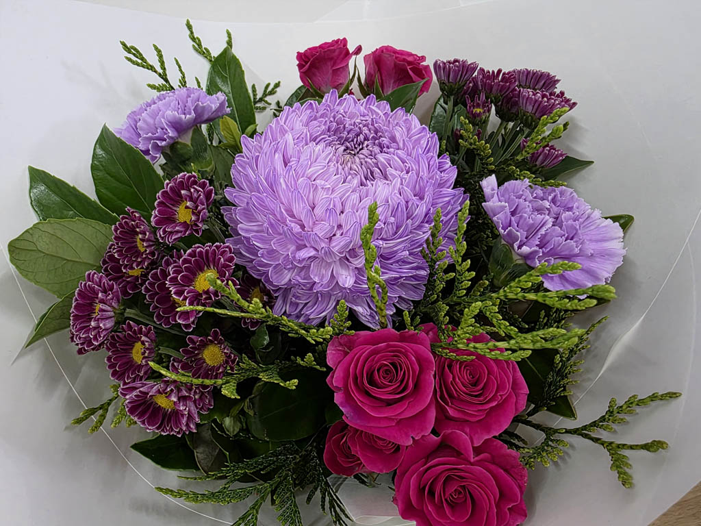 Vibrant and full of personality, this striking posy combines rich purple blooms with bold hot pink flowers for a joyful burst of colour.