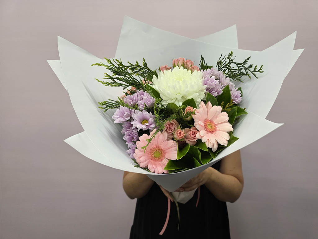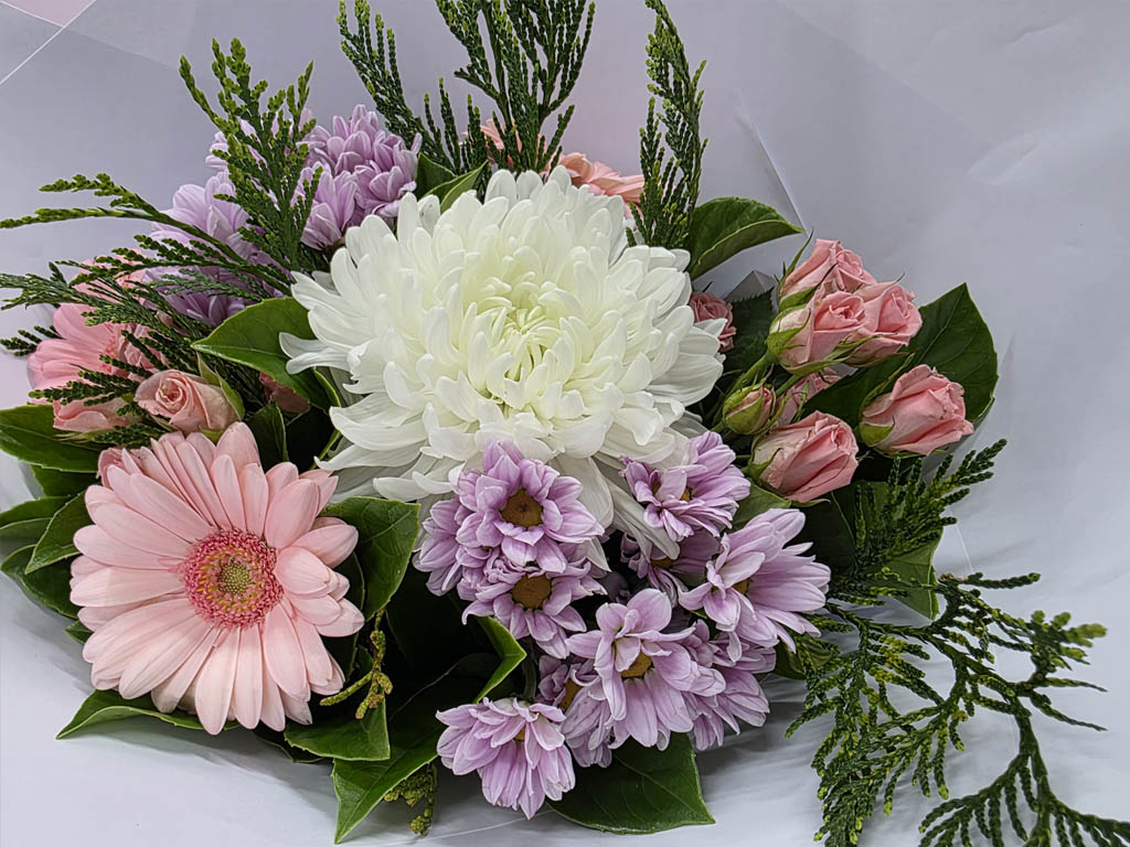 A seasonal mix of fresh flowers including Chrysanthemum, Rose, Gerbera and mixed foliage.
