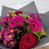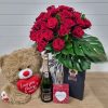 Bouquet of 24 beautifully presented long stemmed red roses with lush tropical foliage.