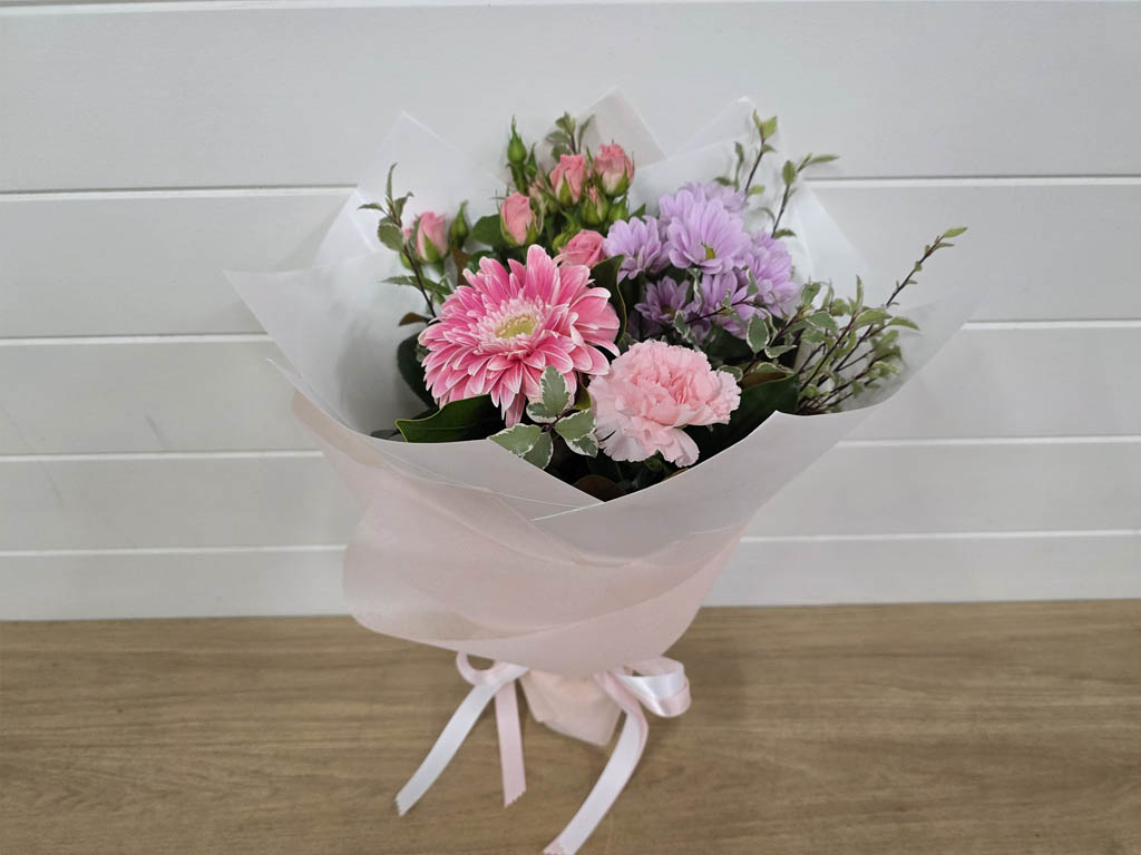 A petite bundle of soft beauty, this pastel posy features spray roses, carnation, gerbera and chrysanthemums in delicate tones.